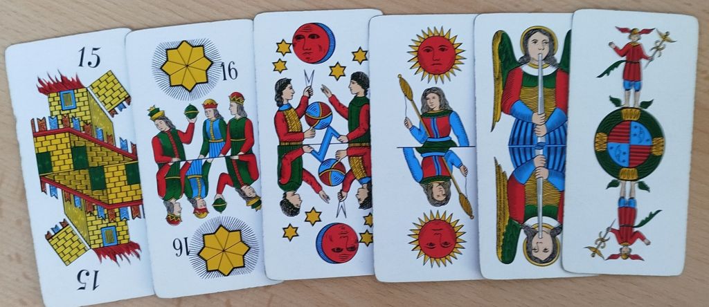 My teacher’s hypothesis as to why traditional fortune-tellers seem to only use a reduced deck is that the cards were all employed in some older method, but the oral transmition of the tradition caused some meanings to go lost. I incline more toward the idea that the fortune-tellers of Bologna simply wanted a slimmer deck that could be used in large spreads (we will see in a future article that most spreads using this tarot deck employ many cards, some even the whole deck).