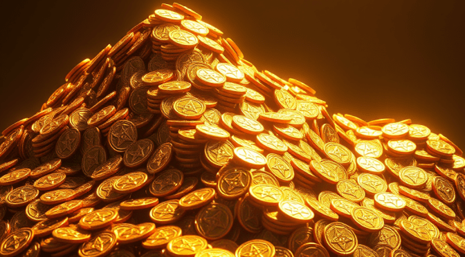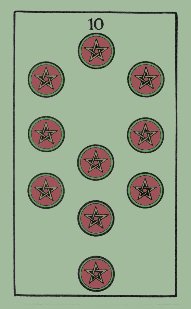 The disks, or (as they have now become) coins, are arranged on the Tree of Life, but the Tenth coin is much larger than the rest; the image indicates the futility of material gain.