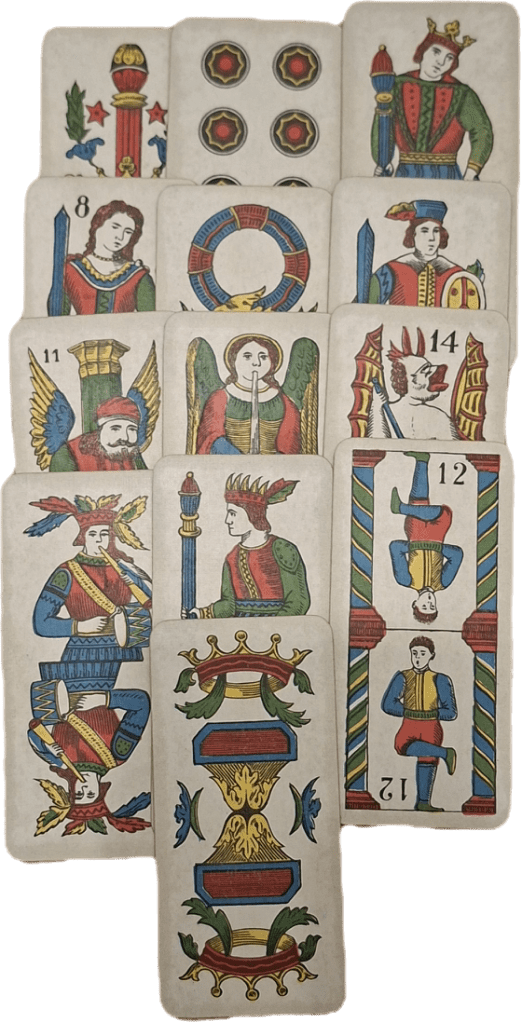 I used the Bolognese tarot, since this is the deck I’m currently studying, and the thirteen card spread, which is the most common spread with this deck.