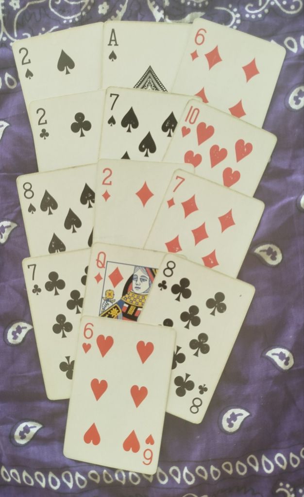 As can be seen, even without interpreting the spread, there is no trace of haunting in the cards. The final two cards, the Nine of Diamonds and the Ten of Diamonds, are a lucky combination, they can show success, protection or even simply the fact that the “energy” is clean, not charged with magical or paranormal forces. The querent shows up at the beginning of the spread with the Three of Diamonds, which is a doubtful card in this context. It makes me think more about random things that she, the Queen, misinterpreted.