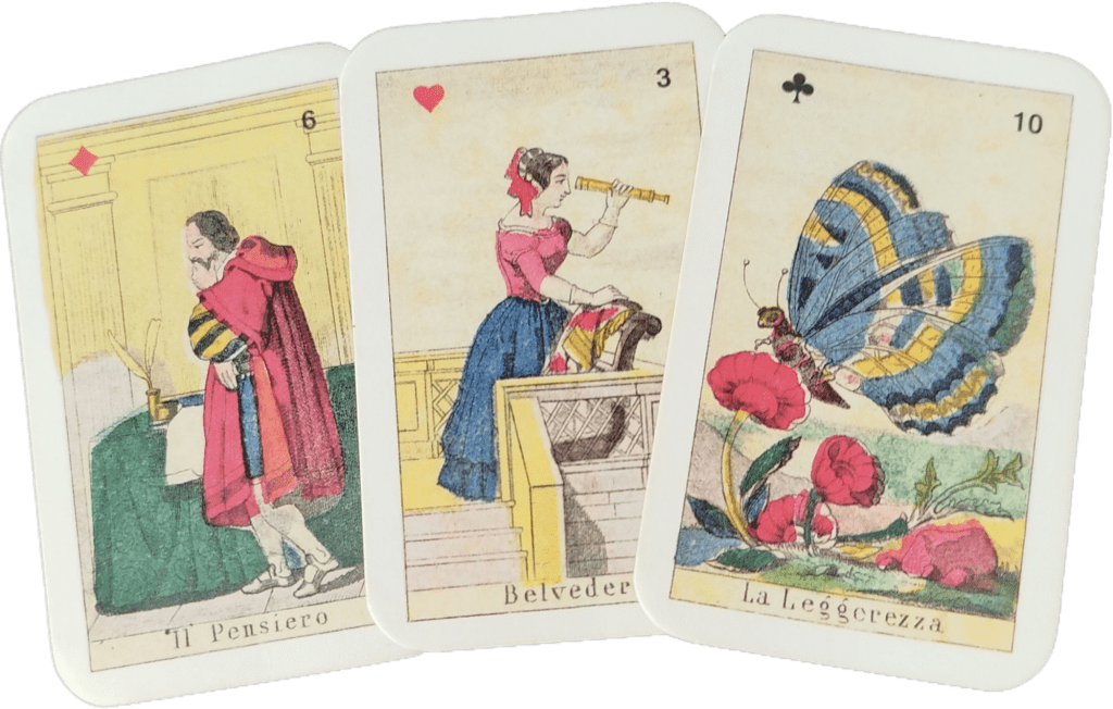 This is a cool reading because it shows that the cards tend to describe a situation and take their time to do so, so that trying to immediately get a yes or no out of them can be problematic and cause mistakes (though making mistakes is part of the human condition, obviously). This is the reason why, talking about the Bolognese tarot, I tend to disregard the yes and no rule of the Death card. It is also the reason why I don’t believe in the yes and no value of playing card colors.  To me, that’s just a coin flip, and coin flips don’t work as reliably as actual divination, which is a language.
