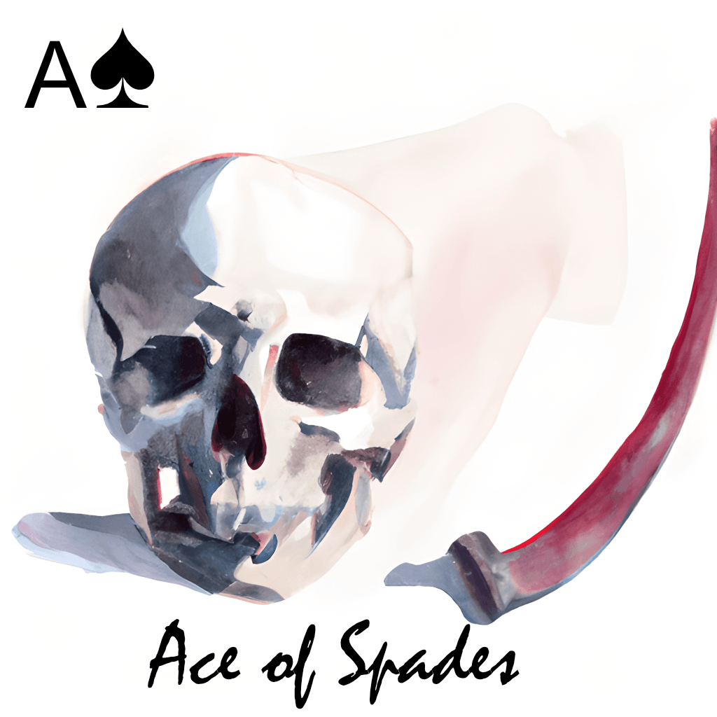 All aces in cartomancy have to do with beginnings, but because the suit of Spades is negative, it turns the meaning into the opposite, that of ending. Ending comes in many forms, although the most vivid archetype of change is, of course, death. This meaning, however, is drastic and should only be applied when with other horrible cards. More often than not, the Ace of Spades brings change. We have another card in the deck that brings change, namely the Five of Diamonds. In the case of the Ace of Spades, though, the change is drastic and likely to be less gradual and more important, often (but not always) negative and usually rather traumatic even when it ends well.