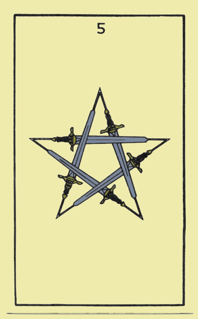 This card, like the Four, suggests the policy of appeasement. The symbol shows six Swords with their hilts in crescent formation. Their points meet below the centre of the card, impinging upon a blade of a much larger up-thrusting sword, as if there were a contest between the many feeble and the one strong. He strives in vain.