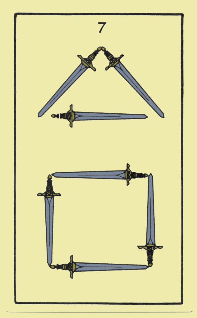 The Seven of Swords is called Futility. This is a yet weaker card than the Seven of Wands. It has a passive sign instead of an active one, a passive planet instead of an active one. It is like a rheumatic boxer trying to “come back” after being out of the ring for years. Its ruler is the Moon. The little energy that it possesses is no more than dream-work; it is quite incapable of the sustained labour which alone, bar miracles, can bring any endeavour to fruition. The comparison with the Seven of Wands is most instructive.