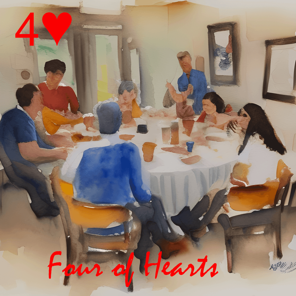 The Four of Hearts is the card of reunions, gatherings and positive social occasions. It is also a symbol of agreements that come easy or are easily restored (Hearts): harmony and affinity all play into the meaning of the card. Because of the emotional connotation of the suit, the card can signify sex.