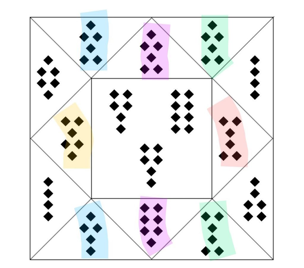 If we take the figure in the first house (marked in yellow) as a reference point, then the figures in blue sextile it, because they are separated from it by a single sign; the figures in purple square it, because they are separated from it by two houses; the figures in green trine it because they are separated from it by three houses, and the figure in red opposes it, since it occupies the houses directly opposite.