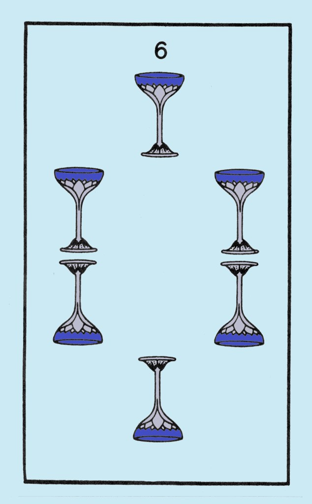 This card represents a conflicting element. On the one hand, it receives the influence of the Ten, Malkah the Virgin. The arrangement of the cups is that of the Tree of Life. But, on the other hand, they are themselves unstable. They are tilted; they spill the water from the great Lotus which overhangs the whole system from one into the other.