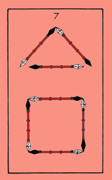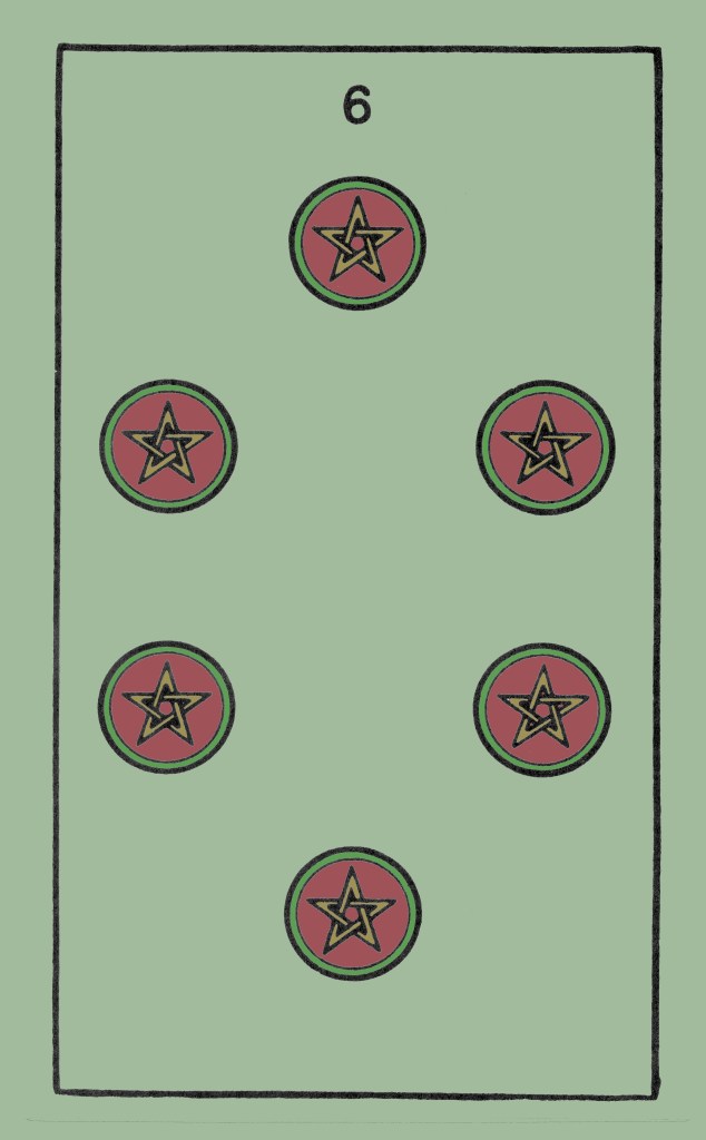 The disks are arranged as an equilateral triangle of three, apex upwards, close together; and, surrounded at some distance by a ring, six larger disks in the form of a hexagon. This signifies the multiplication of the original established Word-by the mingling of “good luck and good management”. The three central disks are of the magical pattern as in earlier cards; but the others, since the descent into matter implies the gradual exhaustion of the original whirling energy, now take on the form of coins. These may be marked with the magical images of the appropriate planets.