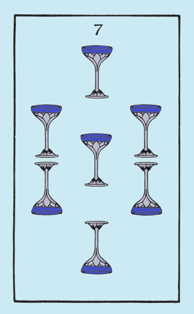The Seven of Cups is called Debauch. This is one of the worst ideas that one can have; its mode is poison, its goal madness. It represents the delusion of Delirium Tremens and drug addiction; it represents the sinking into the mire of false pleasure. There is something almost suicidal in this card. It is particularly bad because there is nothing whatever to balance it-no strong planet to hold it up. Venus goes after Venus, and Earth is churned into the scorpion morass.